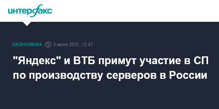 Москва. 3 июня. INTERFAX.RU - Интернет-компания "Яндекс", банк ВТБ, группа компаний "Ланит" и производитель компьютерной техники Gigabyte договорились о создании совместного предприятия (СП), которое займется производством серверов на территории РФ. Соответствующее соглашение стороны подписали в четверг на ПМЭФ-2021.