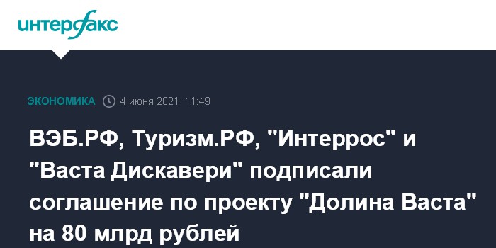 Москва. 4 июня. INTERFAX.RU - ВЭБ.РФ, корпорация "Туризм.РФ", компании "Интеррос" и "Васта Дискавери" в рамках ПМЭФ-21 подписали соглашение о совместной реализации проекта по созданию всесезонного горного курорта "Долина Васта" в Сочи, говорится в совместном релизе.