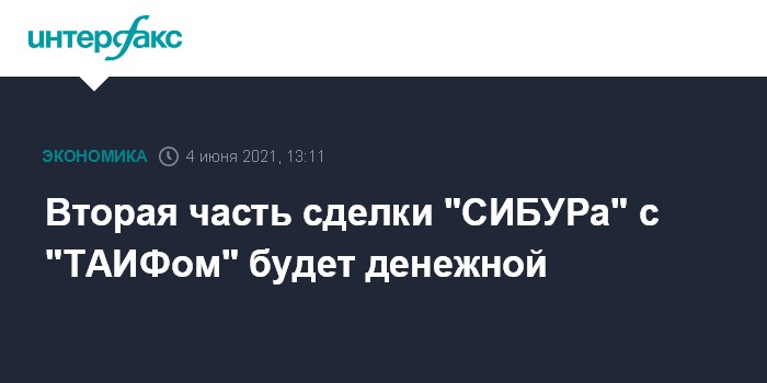 Москва. 4 июня. INTERFAX.RU - Вторая часть сделки слияния "СИБУРа" с "ТАИФом" будет денежной, сообщил журналистам в кулуарах ПМЭФ председатель правления "СИБУРа" Дмитрий Конов.