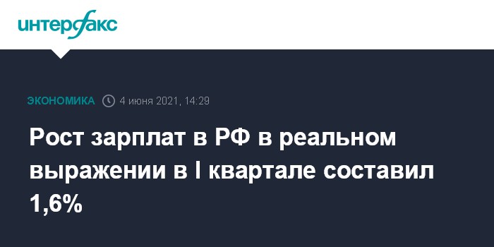 Москва. 4 июня. INTERFAX.RU - Рост реального размера (с поправкой на инфляцию) заработной платы в РФ в I квартале 2021 года составил 1,6% в годовом выражении. Об этом говорится в опубликованных на сайте единой межведомственной статсистемы данных Росстата.