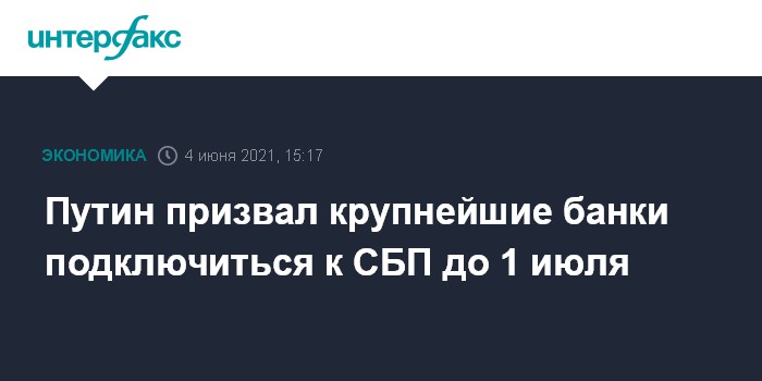 Москва. 4 июня. INTERFAX.RU - Крупнейшим российским банкам нужно подключиться к системе быстрых платежей (СБП) уже в ближайшее время - до 1 июля 2021 года, сообщил президент РФ Владимир Путин на Петербургском международном экономическом форуме (ПМЭФ).
