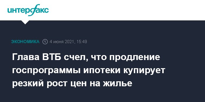 Глава ВТБ счел, что продление госпрограммы ипотеки купирует резкий рост цен на жилье