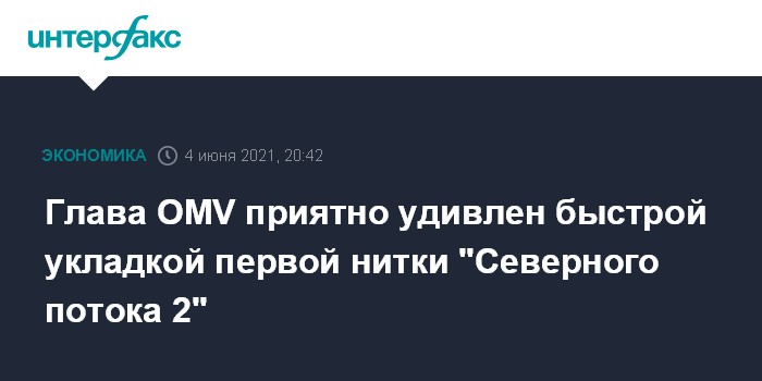 Москва. 4 июня. INTERFAX.RU - Завершение укладки первой нитки газопровода "Северный поток 2" в начале июня стало приятной неожиданностью для компании OMV - участника проекта.