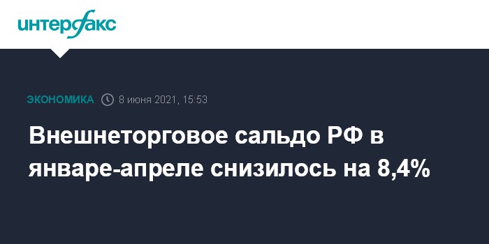 Москва. 8 июня. INTERFAX.RU - Положительное внешнеторговое сальдо РФ в январе-апреле 2021 года составило $41,2 млрд, что на $3,8 млрд (на 8,4%) меньше показателя за январь-апрель 2020 года, сообщила Федеральная таможенная служба (ФТС) во вторник.