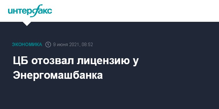 Москва. 9 июня. INTERFAX.RU - Банк России с 9 июня отозвал лицензию на проведение банковских операций у петербургского Банка энергетического машиностроения (ПАО "Энергомашбанк"), сообщила пресс-служба регулятора. Одна из причин отзыва - полная утрата банком собственных средств.
