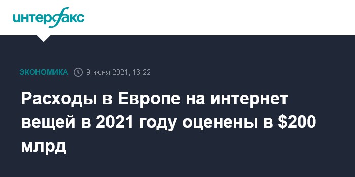 Москва. 9 июня. INTERFAX.RU - Расходы на интернет вещей (Internet of Things, IoT) в Европе в 2021 году превысят $200 млрд, при этом двухзначные темпы их роста будут сохраняться до конца 2025 года, прогнозируют аналитики исследовательской компании International Data Corporation (IDC).