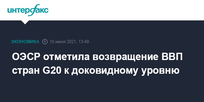 Москва. 10 июня. INTERFAX.RU - Объем ВВП стран G20 в первом квартале вернулся к допандемийному уровню, увеличившись на 0,8% относительно предыдущих трех месяцев, сообщается в отчете Организации экономического сотрудничества и развития (ОЭСР).
