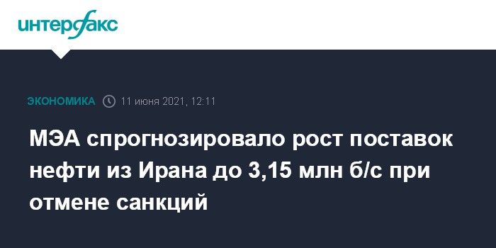 Москва. 11 июня. INTERFAX.RU - Иран при отмене санкций США, возможном в случае возобновления ядерной сделки в предстоящие недели, может нарастить поставки нефти на 750 тыс. б/с - до 3,15 млн б/с к концу этого года и ко второму полугодию 2022 года выйти на полную мощность в 3,8 млн б/с, полагают эксперты Международного энергетического агентства (МЭА).