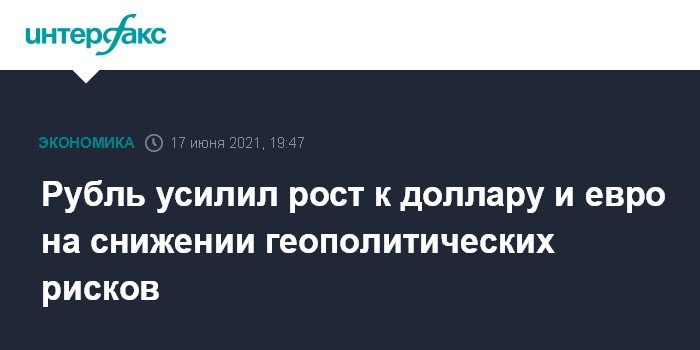 Москва. 17 июня. INTERFAX.RU - Доллар немного снижается, евро демонстрирует намного более заметное ослабление на Московской бирже в четверг вечером, разница в их динамике обусловлена итогами заседания Федеральной резервной системы (ФРС) США по ставке, состоявшегося накануне. Рубль уверенно растет к бивалютной корзине, отыгрывая, в том числе, ослабление геополитических рисков после переговоров глав РФ и США Владимира Путина и Джозефа Байдена, состоявшихся также в среду.