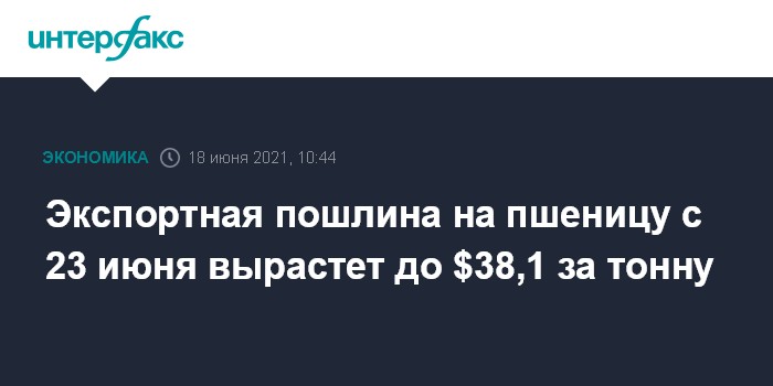 Москва. 18 июня. INTERFAX.RU - Экспортная пошлина на пшеницу с 23 июня составит $38,1 за тонну, следует из данных Минсельхоза РФ.