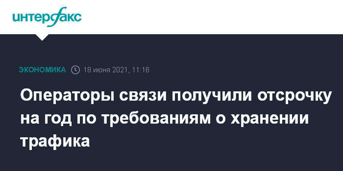 Москва. 18 июня. INTERFAX.RU - Операторы связи и интернет-провайдеры получили годичную отсрочку в выполнении требований о ежегодном увеличении ёмкости хранения трафика. Соответствующее постановление подписал премьер-министр РФ Михаил Мишустин.