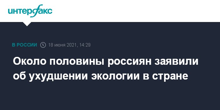Москва. 18 июня. INTERFAX.RU - Около половины граждан России (45%) считают, что экологическая ситуация в стране за последние годы ухудшилась, среди сограждан в возрасте 18-30 лет такого мнения придерживаются 53% респондентов, свидетельствуют данные опроса Фонда "Общественное мнение", поступившие в пятницу в "Интерфакс".
