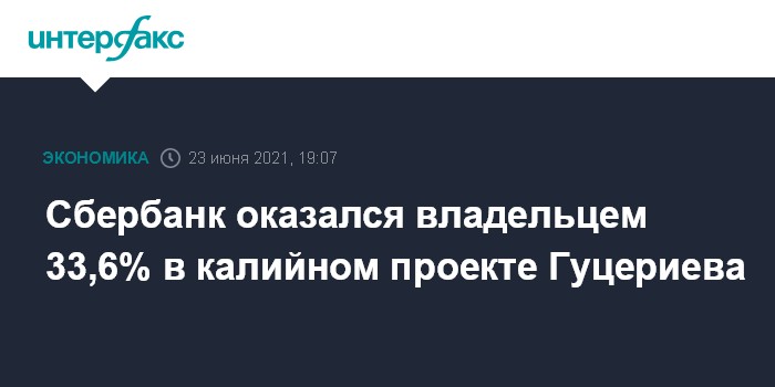 Москва. 23 июня. INTERFAX.RU - Группа Сбербанка оказалась владельцем 33,6% акций "Славкалия" – компании, созданной Михаилом Гуцериевым для строительства калийного ГОКа в Белоруссии.