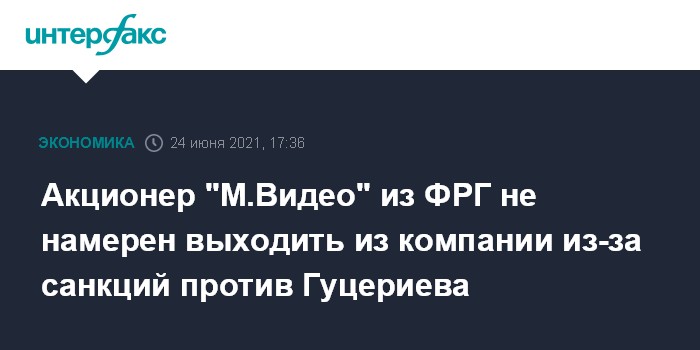 Москва. 24 июня. INTERFAX.RU - Германская Ceconomy, владеющая 15% акций ПАО "М.Видео", не намерена выходить из капитала компании в связи с внесением в санкционные списки Евросоюза Михаила Гуцериева.