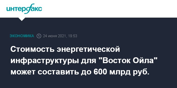 Москва. 24 июня. INTERFAX.RU - ПАО "Интер РАО" оценивает стоимость всей энергетической инфраструктуры (включая генерацию и сети) для проекта "Восток Ойл" в 500-600 млрд руб., сообщил Renaissance Capital по итогам встречи с топ-менеджерами энергохолдинга.