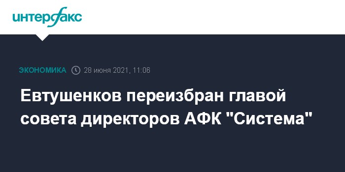 Москва. 28 июня. INTERFAX.RU - Совет директоров ПАО АФК "Система" переизбрал своим председателем основного владельца корпорации Владимира Евтушенкова, говорится в пресс-релизе АФК.