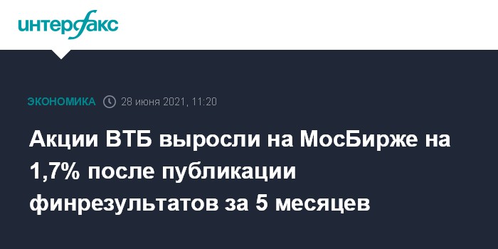 Москва. 28 июня. INTERFAX.RU - Акции ВТБ растут на МосБирже на 1,7% (до 4,9345 копейки за штуку) после публикации сильных финансовых результатов за 5 месяцев 2021 года; при этом повышение индексов МосБиржи и РТС составляет порядка 0,4-0,5%.