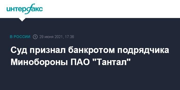 Суд признал банкротом подрядчика Минобороны ПАО "Тантал"