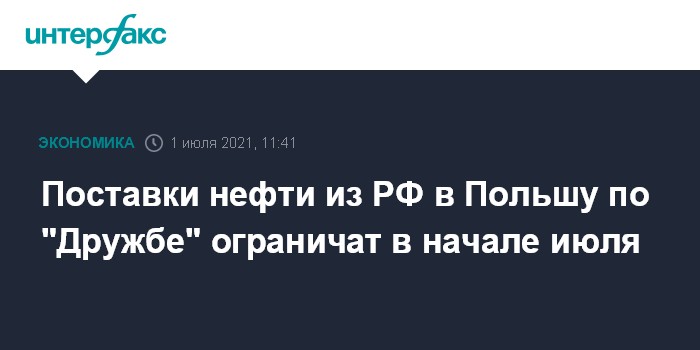 Москва. 1 июля. INTERFAX.RU - Поставки нефти из РФ по магистральному нефтепроводу "Дружба" в направлении Польши будут ограничены в течение первой декады июля.