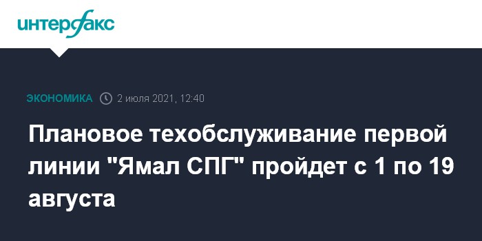 Москва. 2 июля. INTERFAX.RU - Планово-предупредительное техническое обслуживание первой технологической линии завода по сжижению природного газа "Ямал СПГ" будет проведено с 1 по 19 августа, сообщила компания.