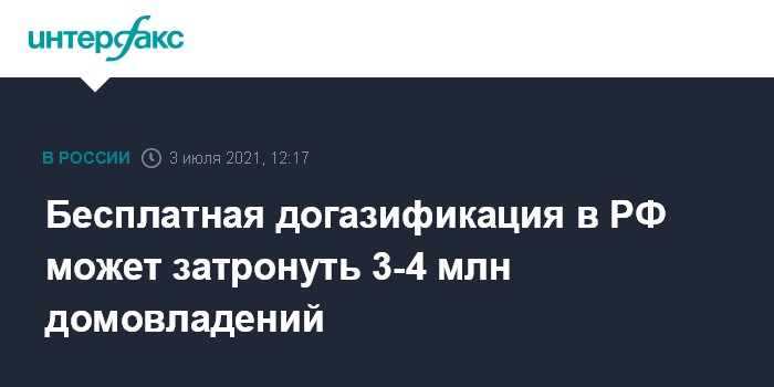 Москва. 3 июля. INTERFAX.RU - Бесплатная догазификация в РФ может коснуться около 3-4 млн домовладений, сообщил вице-премьер РФ Александр Новак в программе "Вести с Сергеем Брилевым" телеканала "Россия 1" (ВГТРК).