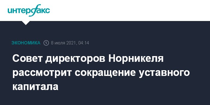 Москва. 8 июля. INTERFAX.RU - Совет директоров "Норникеля" 12 июля рассмотрит предложения по уменьшению уставного капитала компании и внесению изменений в устав, сообщила ГМК.