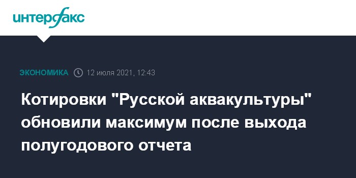 Москва. 12 июля. INTERFAX.RU - Котировки ПАО "Русская аквакультура" обновили максимум вслед за выходом неплохого отчета за I полугодие. На "Московской бирже" акции ПАО к 12:15 дорожали на 1,8:, до 376,5 рубля за штуку, объем торгов составил 6,45 млн рублей.