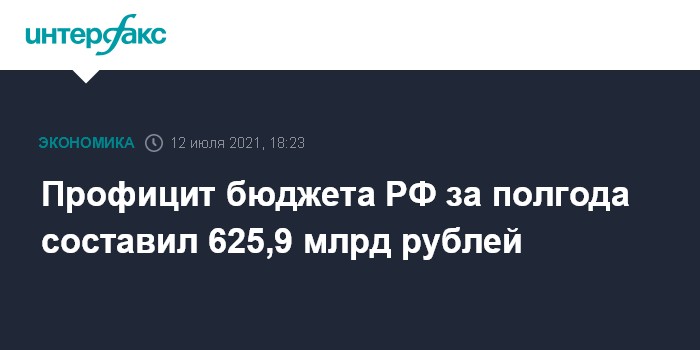 Москва. 12 июля. INTERFAX.RU - Федеральный бюджет РФ в январе-июне 2021 года, по предварительной оценке, исполнен с профицитом в размере 625,913 млрд рублей, сообщил Минфин. Министерство вновь не стало публиковать оценку размера дефицита/профицита по отношению к объему ВВП, хотя в мае этот показатель появлялся в материалах министерства после паузы в 9 месяцев.
