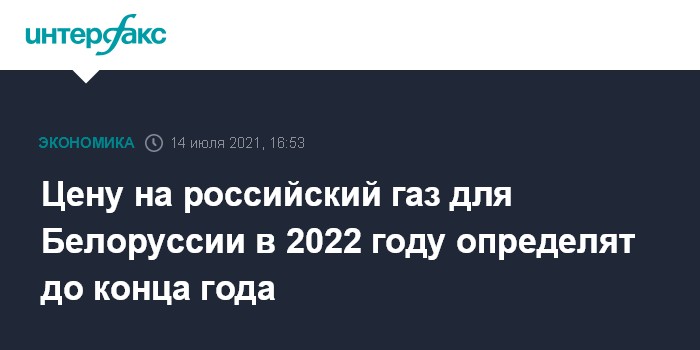 Москва. 14 июля. INTERFAX.RU - Цена на российский газ для Белоруссии в 2022 году будет окончательно установлена до конца текущего года, заявила пресс-секретарь белорусского президента Наталья Эйсмонт.