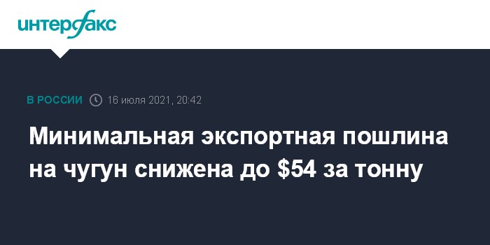 Москва. 16 июля. INTERFAX.RU - Премьер-министр Михаил Мишустин подписал постановление о снижении минимальной экспортной пошлины на чугун до $54 за тонну. Документ есть в распоряжении "Интерфакса".