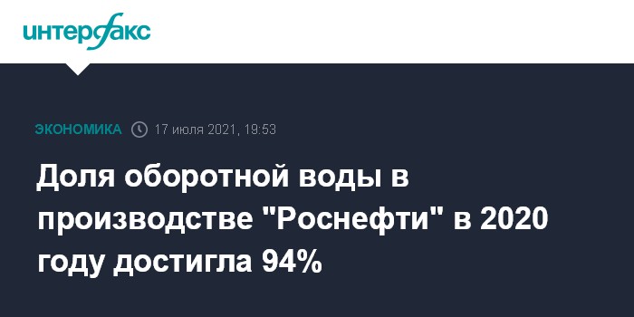 Москва. 17 июля. INTERFAX.RU - "Роснефть" по итогам 2020 года довела долю оборотной и повторно используемой в производственной деятельности воды до 94%, сообщает пресс-служба компании.