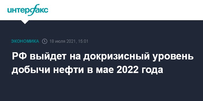 Москва. 18 июля. INTERFAX.RU - Россия с учетом принятых в воскресенье решений ОПЕК+ сможет в мае 2022 года выйти на докризисный уровень добычи, увеличивая добычу на 100 тыс. баррелей в сутки каждый месяц, заявил вице-премьер РФ Александр Новак в интервью телеканалу "Россия 24" (ВГТРК).