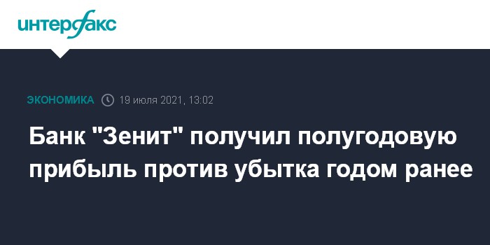 Москва. 19 июля. INTERFAX.RU - В I полугодии 2021 года банк "Зенит" получил 2,5 млрд рублей чистой прибыли по РСБУ против 400 млн рублей чистого убытка годом ранее.