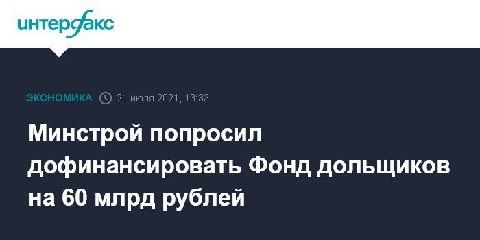 Москва. 21 июля. INTERFAX.RU - Минстрой России просит дофинансировать Фонд защиты прав дольщиков на 60 млрд рублей из бюджета на 2022-2024 годы, сообщил "Интерфаксу" источник, знакомый с предложениями ведомства. Он уточнил, что в 2022 году Минстрой просит для фонда 30 млрд рублей, в 2023 году - еще 20 млрд рублей, и в 2024 году - 10 млрд рублей.