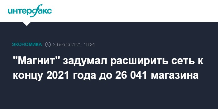 Москва. 26 июля. INTERFAX.RU - Ритейлер "Магнит" по итогам 2021 года увеличит сеть магазинов до 26 041 точки с 21 564 точек на конец 2020 года с учетом 2000 магазинов, запланированных к открытию, и 2 477, купленных у "Дикси". Об этом говорится в презентации "Магнита", посвященной сделке.