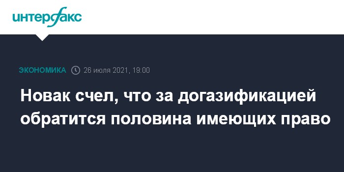 Москва. 26 июля. INTERFAX.RU - Лишь около половины граждан, чьи домовладения подпадают под условия бесплатного подключения к газу в газифицированных населенных пунктах (догазификации), обратятся за подключением - такое мнение вице-премьер РФ Александр Новак высказал в беседе с журналистами по итогам встречи с секретарем Генсовета партии "Единая Россия" Андреем Турчаком.