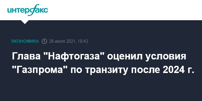 Москва. 26 июля. INTERFAX.RU - Недавнее заявление "Газпрома" о том, что продолжение транзита через Украину после 2024 года ставится в зависимость от приобретения у него компаниями из ЕС дополнительных объемов ресурса по новым контрактам, является подтверждением использования "Газпромом" газа как геополитического оружия против Украины и ЕС. Такую точку зрения высказал в своем фейсбуке глава НАК "Нафтогаз Украины" Юрий Витренко.