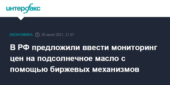 Москва. 26 июля. INTERFAX.RU - Минсельхоз предлагает ввести в РФ мониторинг цен на подсолнечное масло с помощью биржевых механизмов, следует из материалов рабочей группы по таможенно-тарифному регулированию и ответным мерам во внешней торговле таможенной комиссии.