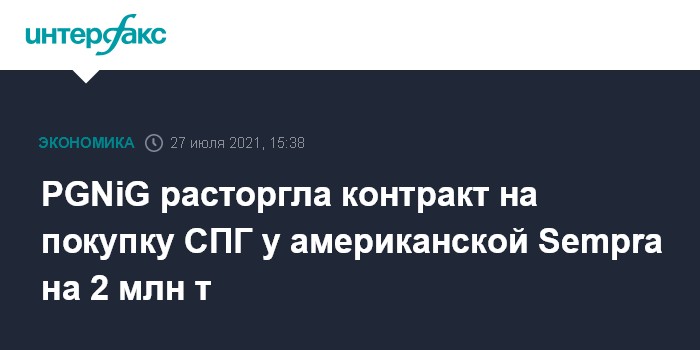Москва. 27 июля. INTERFAX.RU - Польская PGNiG расторгла 20-летний контракт, заключенный в 2018 году, на поставку 2 млн т сжиженного природного газа (СПГ) в год с "дочкой" американской Sempra Energy – Port Arthur LNG, которая планировала построить одноименный завод, сообщили в компании.