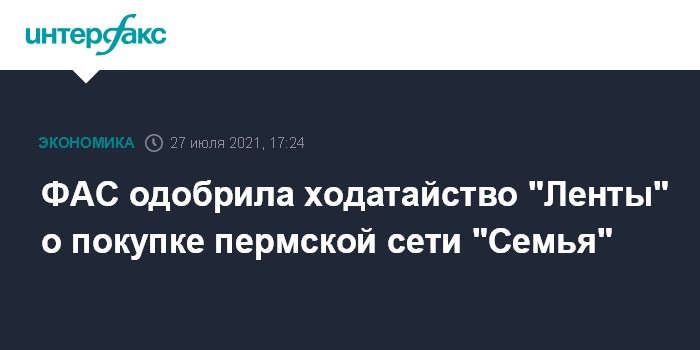 Москва. 27 июля. INTERFAX.RU - Федеральная антимонопольная служба (ФАС) удовлетворила ходатайство "Ленты" о покупке пермской розничной сети "Семья".