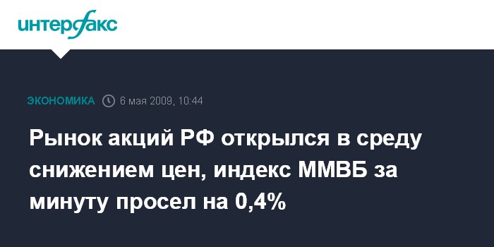 Москва. 6 мая. INTERFAX.RU - Рынок акций РФ открылся в среду снижением цен большинства blue chips на фоне ухудшения внешней конъюнктуры, индекс ММВБ за минуту торгов просел на 0,4%.