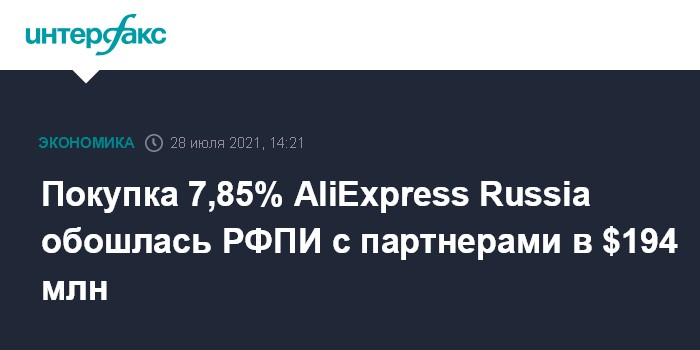 Создание СП в сфере электронной коммерции AliExpress Russia было завершено РФПИ, Alibaba, "Мегафоном" и Mail.ru Group в октябре 2019 года. Тогда РФПИ зарезервировал право на приобретение 7,85% акций СП у Alibaba.