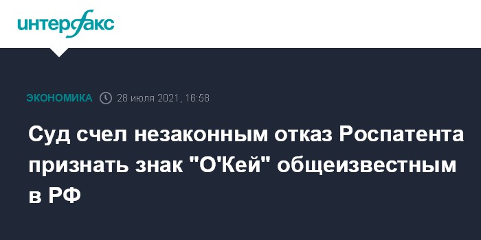 Москва. 28 июля. INTERFAX.RU - Суд по интеллектуальным правам (СИП) в среду удовлетворил заявление ООО "О'Кей" (Санкт-Петербург) о признании недействительным решения Роспатента от 19 ноября 2020 года, отказавшегося признать одноименный товарный знак общеизвестным в России.