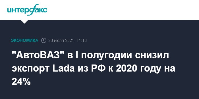 Москва. 30 июля. INTERFAX.RU - Экспорт автомобилей Lada в I полугодии 2021 года упал в годовом выражении на 24,4%, до 15229 штук. Это следует из отчетности группы Renault, являющейся основным акционером российского автопроизводителя (68%).