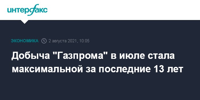 В июле 2021 года добыча монополии составила 38,2 млрд куб. м. Это существенно больше, чем в июле 2020 (32 млрд куб. м), и с поправкой на добычу газа на востоке России (около миллиарда кубометров) заметно выше, чем в июле 2019 (35,75 млрд куб. м).