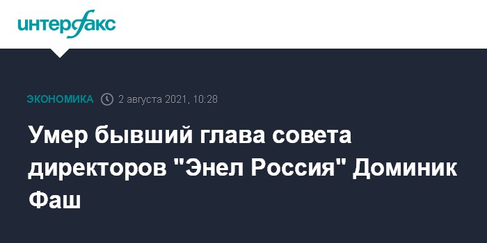 Москва. 2 августа. INTERFAX.RU - Умер бывший председатель совета директоров ПАО "Энел Россия" и одна из самых заметных фигур в российской энергетике 2000-х годов Доминик Фаш, сообщила ассоциация "Глобальная энергия". В последние годы Фаш входил в международный комитет премии этой ассоциации.
