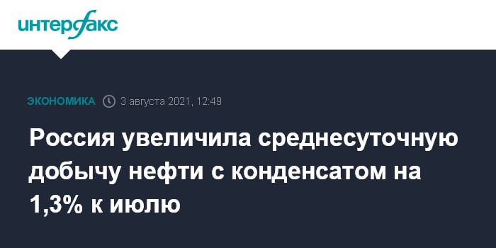 Россия увеличила среднесуточную добычу нефти с конденсатом на 1,3% к июлю