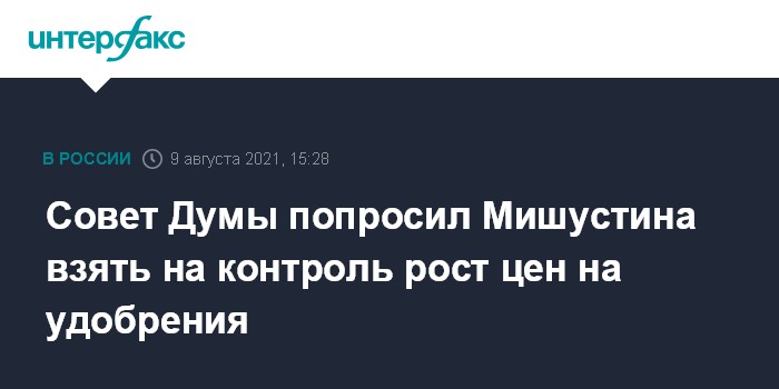 Москва. 9 августа. INTERFAX.RU - В связи с подорожанием минеральных удобрений Совет Госдумы решил подготовить обращение к премьер-министру Михаилу Мишустину и попросить его взять ситуацию на контроль, сообщил в телеграм-канале спикер палаты Вячеслав Володин.