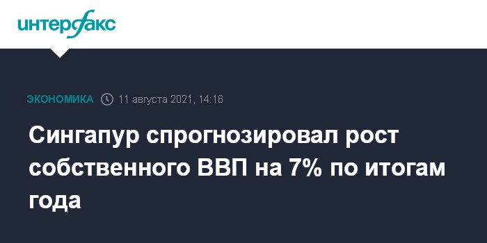 Москва. 11 августа. INTERFAX.RU - Министерство торговли и промышленности Сингапура сообщило, что увеличило прогноз роста ВВП страны в 2021 году до 6-7% с ранее озвученных 4-6%.