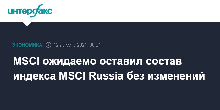 Москва. 12 августа. INTERFAX.RU - Индексный провайдер MSCI сообщил, что по итогам квартального пересмотра оставил состав индекса MSCI Russia без изменений. Как и ожидалось, каких-либо исключений или добавлений бумаг в расчетную базу индекса MSCI Russia в рамках августовского пересмотра не произошло.